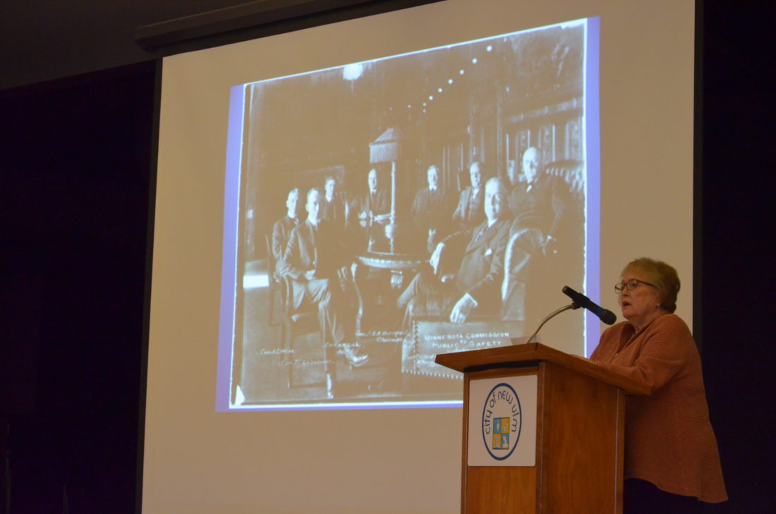 Staff photo by Connor Cummiskey Mary Wingerd presents her take on the motives behind the authoritarian Minnesota Commission of Public Safety, Thursday in New Ulm. A photo of the commission is displayed behind Wingerd as part of her presentation.