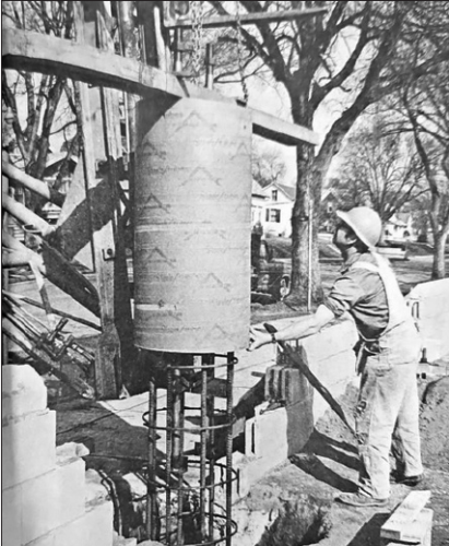 JOHNSON FIELD in New Ulm will have a press box in time for the 1975 football season as construction continues on the new press facility. A construction worker puts in a reinforcing structure for the footing into place. (Photo by Ron Grieser)