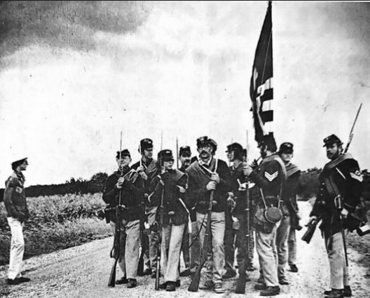 STRAINS of the Battle Hymn of the Republic echoed through the countryside as men portraying the first Minnesota Infantry Division of the Civil War sang robustly on their four mile march last weekend from the Sportsmen Club southwest of Fairfax Fort Ridgley. Above, the men are shown on their march to Fort Ridgely. Right, Chuck Fouzia holds an authentic Civil War cup. The 32 men, all from the Twin Cities, must bear their own expenses and take pride in sporting the Civil War regalia.