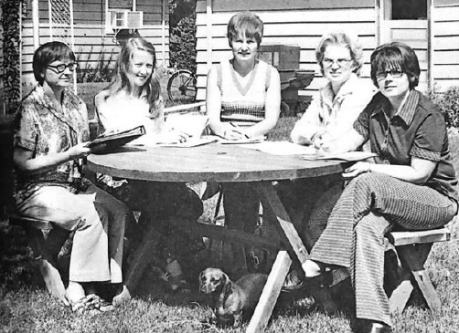 OFFICERS of the League of Women Voters in New Ulm met Wednesday. Left to right around the table are Sylvia Shulte, secretary; Candyce Hansen, first vice president; Mary Palmer, president; Virginia Burnett, second vice president and Linda Moriarty, treasurer. (Photo by Wayne Cook)