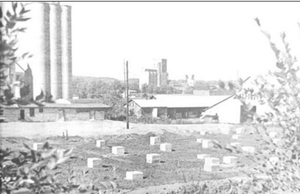 THOSE SILENT gray box-like structures below German Street at First S. are pilings for the new post office. Ground at the site is very soft and workmen ad to go quite a ways to get on solid footing. Now the Postal Service is ready for the next step, letting the bid for construction of the building, expected to be let about Nov. 1. The contractor will have about 10 months to complete the job. The pilings work was done as part of a single contract which included demolishing existing structures and clearing the site in preparation for construction. (Photo by Sally Du Four). New Ulm Daily Journal Sept 29, 1975