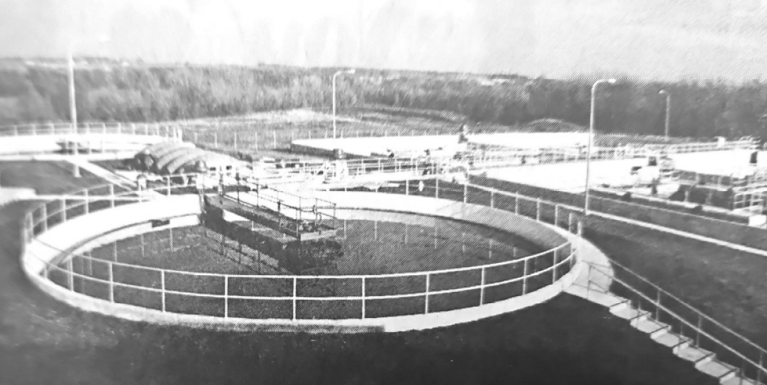 THE TWO primary clarifiers, left,remove settlable and floatable solids from the sewage. The four aeration basins, right, blow air into the activated sludge so the bacteria can breathe while they eat the sewage.