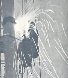 - Sparks rain down, as Ron Kolb, Minneapolis, cuts into one of the legs of the 3M water tower while Dale Fullford, Fairmont, and Alan Dantzman, Winter, Wis., work on one of the supports. Below, sports fly in Kolb’s face as he uses his acetylene torch to cut three-inch strips in five places on the tower leg. (Photos by Art Hanson)