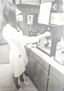 RUTH MOHR is a lab supervisor at New Ulm Medical Clinic. She is using a device which counts red and white blood cells automatically. Blood cell counts are a way of diagnosing illness. (Photo by Art Hanson)