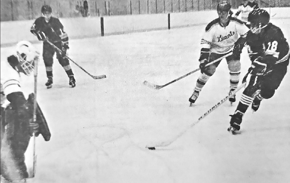 TOM STEINBACH (18) of New Ulm attempts a short flip shot at LeSueur goalie in Saturday’s game at St. Peter. No. 14 on far wing is Pat Davis. New Ulm won 15-2 for its fourth straight victory. (Photo by Don Brand)