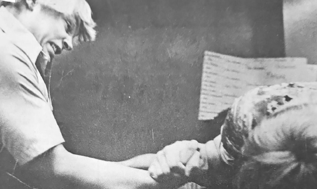 Right: Bruce Lokensgard straining to keep his wrist from touching the table. Bruce rallied form this position to beat Dohn Pagel in the 12th grade boys (180 pounds and above) bracket.