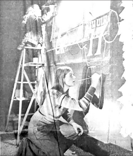 WORKING INTO the night on the New Ulm High School Junior class float for today’s homecoming parade are (front left) Karen Gatewood, 301 N. Franklin, and Linda Schrader, 7 S. Payne. (Photo by Art Hanson) New Ulm Daily Journal Oct. 3, 1975