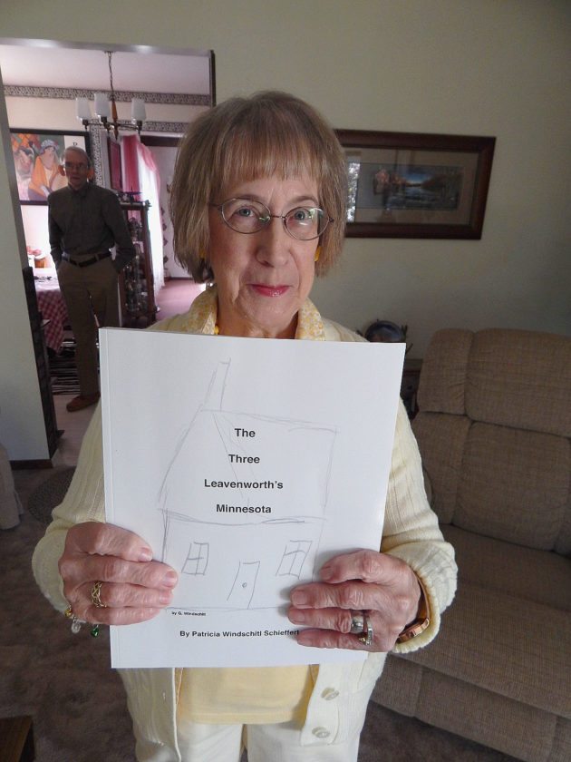 - Patricia Windschitl Schieffert holds a rough draft of her book “The Three Leavenworths Minnesota.”