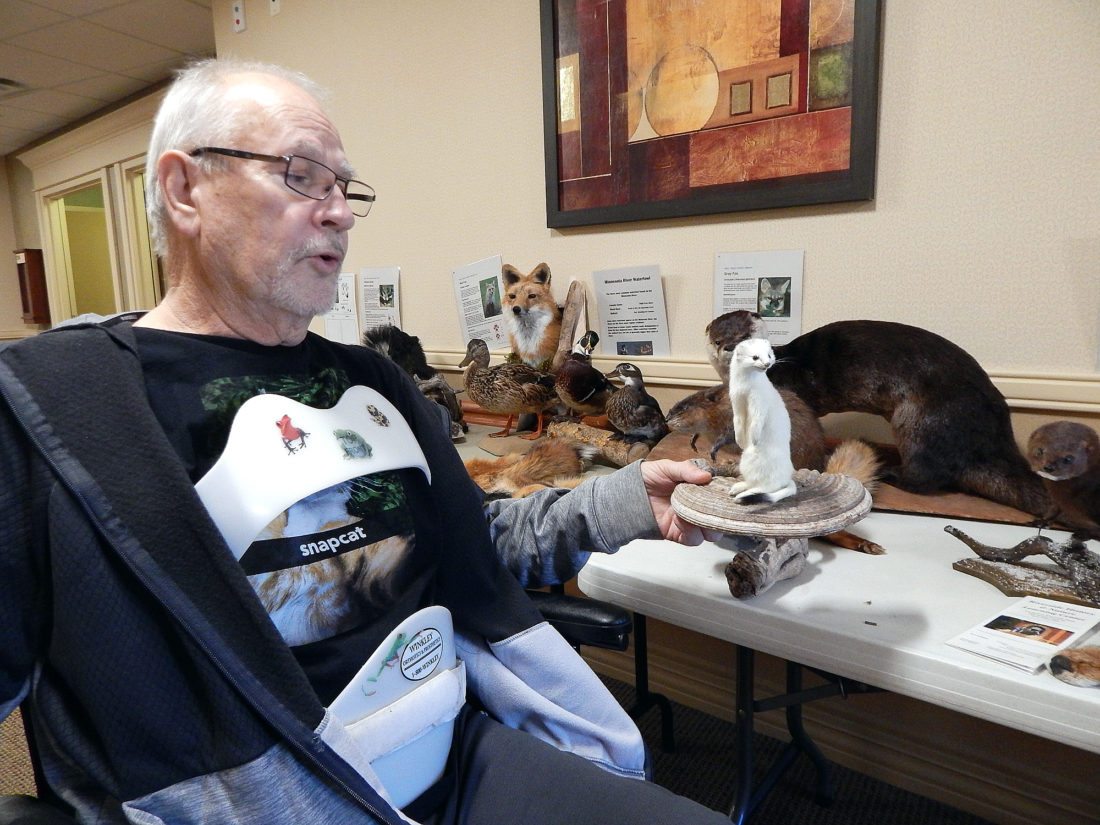 In order to cheer him up, keep him company and entertain Oak Hills residents, visitors and staff, Bolduan’s daughter and son-in-law, Lori and Chad Wengert of New Ulm brought a number of Minnesota River critter mounts and pelts from the Riverside History & Nature Learning Center in Riverside Park.