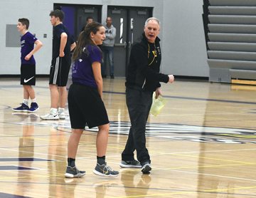 Staff photos by Jeremy Behnke Above and below: Dan Wolfe, an assistant coach at Gustavus Adolphus College, instructs a player at a recent practice for the MN Rise 17U girls’ basketball team.