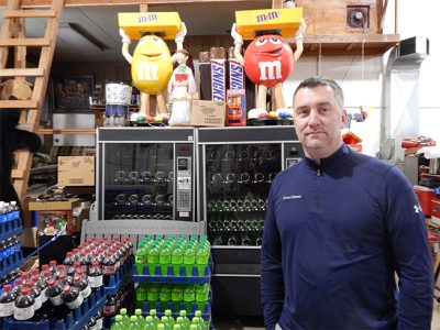 Jeremy Drexler stands in The Candyman shop on Valley St. S. in New Ulm with some of the company’s vending machines, pop, and M & Ms props.