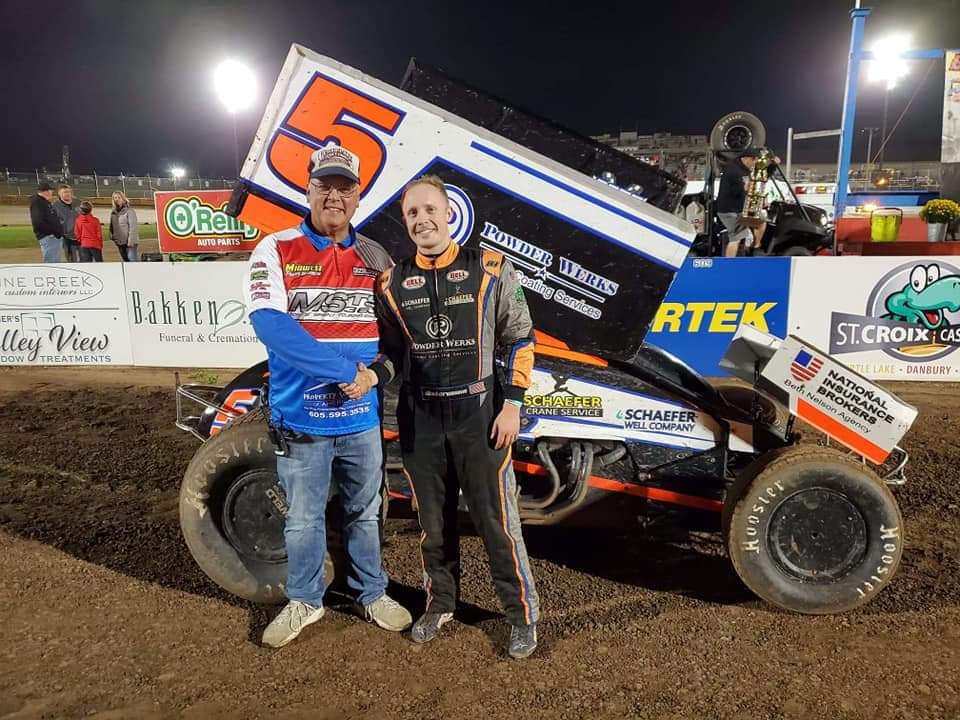 - Above: Ostermann poses for a photo with Greg Parent (promoter of the Midwest Power Series) in victory lane at Cedar Lake Speedway in New Richmond, Wisconsin, after Ostermann won the series’ championship.