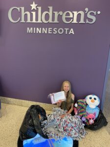 - Autum Stryker poses with donations she gave to the Children’s Cancer Center in Minneapolis/St. Paul. She fundraised $400 to make coloring/workbooks for the cancer patients.