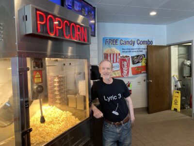 - John Pfieffer posing by the popcorn machine wearing his custom “Lyric Three” shirt, gifted to him by Logan Wick.