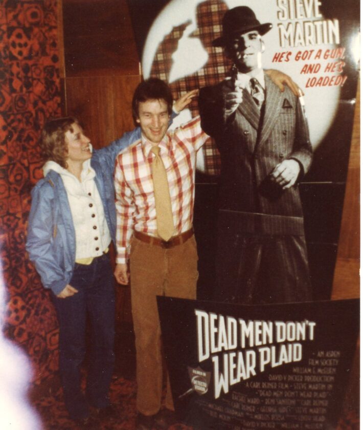 John Pfieffer and his sister Tammy stand by a standee of “Dead Men Don’t Wear Plaid” in 1982. Tammy also worked at the First North theater for a short period of time. Submitted photo.