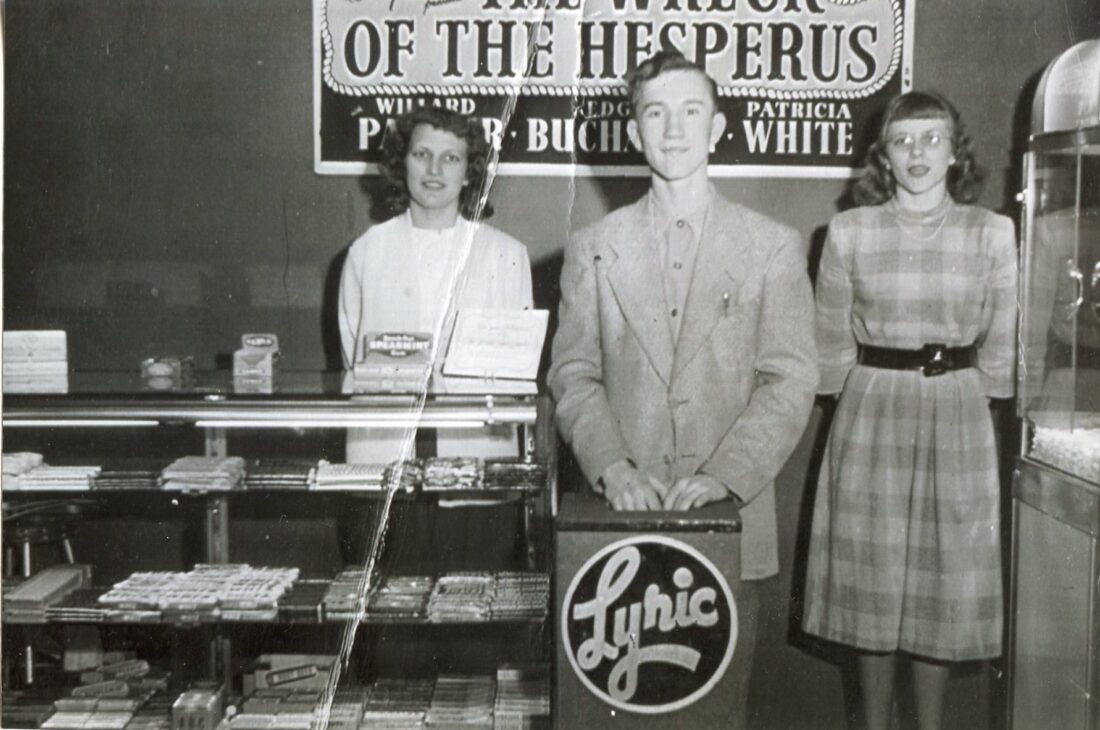 John Pfieffer’s dad Otto Pfieffer by the concession counter at the original “Lyric” theater with co-workers in the early 1950s. The original Lyric would close in 1955. The movie theater at Center and German would take on the Lyric name in 2019.