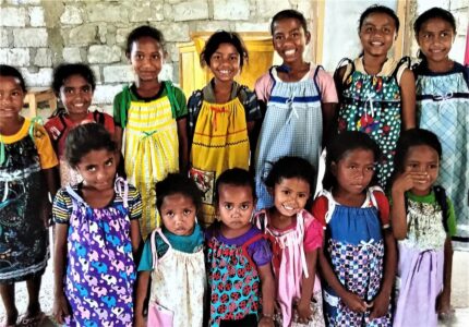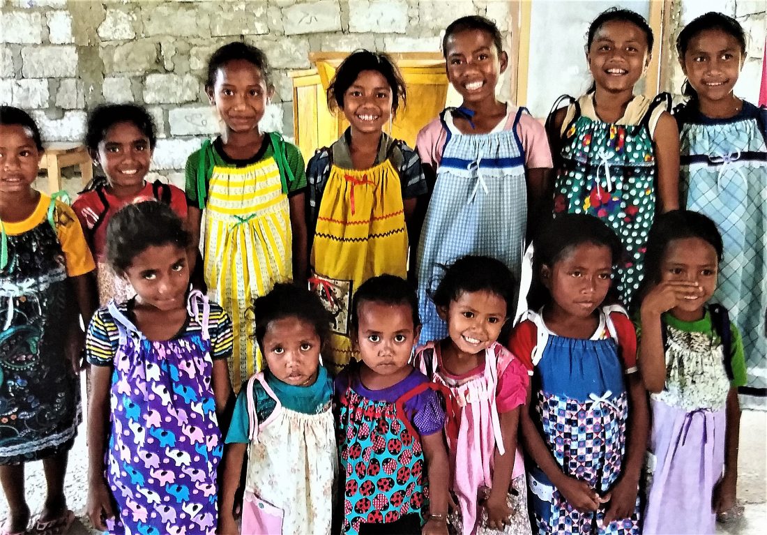 - Submitted photo Indonesian children wear dresses sewn by Little Dresses volunteers. Below, Little Dresses volunteers, front row, from left, Mary Warner, Catherine Cowley. Back row, Miriam Hoffmann, Vicki Versch, Melissa Fitterer and Mariah Koester.