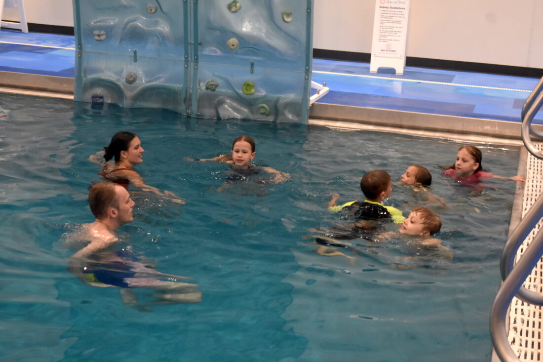 Kids learn how to tread water during their swimming safety class at the New Ulm Rec Center. New Ulm Aquatics and Fitness Coordinator Ben Doeden recommends floaties for younger kids, and lifejackets when out on the lake in a boat fishing.
