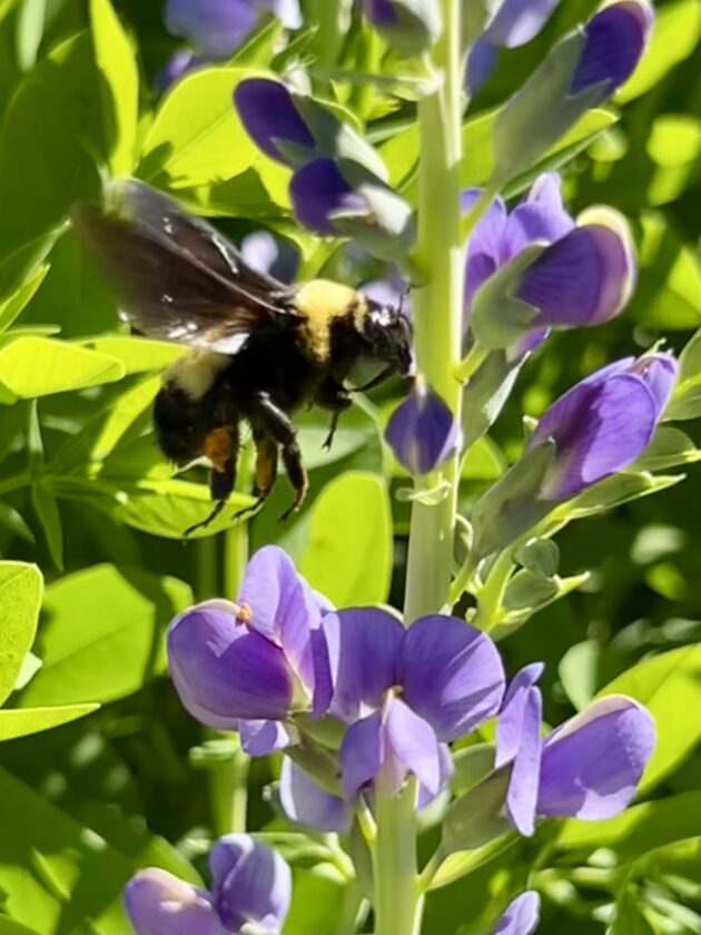 - A bumblebee takes time to visit a baptisia wild indigo plant at Pollinator Park.