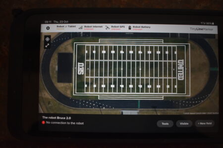 “Once the robot’s five-gallon paint tank is full, I press start and walk away until the paint tank needs refilling,” he said. “The tablet tells me when the tank is empty, what work was done and how long it took. Software saves all the GPS field readings for the next time I paint it. With all the time saved doing this, we can stripe and paint all our fields for younger players now. That helps younger players learn passing routes and time passes easier. It also helps coaches line all players up in proper field position.”