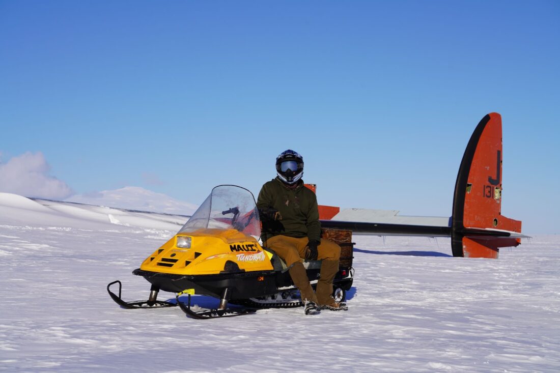David Keller on a snowmobile next to the wreckage of the Lockheed C-121J Super Constellation that crashed near McMurdo Station. Photo by Nick Chisari.
