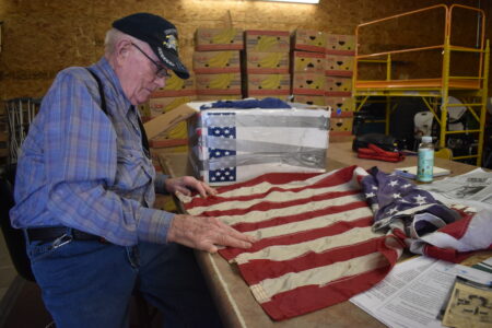 Staff photo by Fritz Busch Daryl Kilmer of Madelia closely examines a U.S. flag he will repair at the New Ulm Disabled American Veterans (DAV) shop.