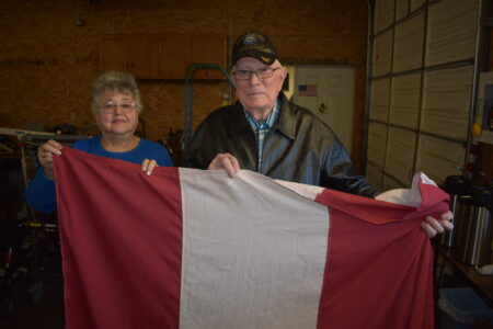Staff photo by Fritz Busch Daryl Kilmer, right, holds a large U.S. flag he will repair at the Brown County Chapter 15 Disabled American Veterans (DAV) site in New Ulm. Kilmer has repaired 32 feet by 19 feet flags flown at Perkins Family Restaurant and on Brown County Highway 27 just east of Sleepy Eye. Kilmer’s wife Joann, who often assists him, is pictured at right.