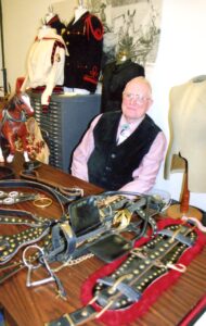 Submitted photo Daryl “Red” Kilmer of Madelia is pictured with horse harness equipment and a wooden horse he created in his upholstery shop.