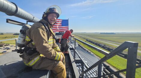 - A climb to remember… On Sept. 11, Nicollet firefighter Danny Sheeks (left) and Courtland firefighter Brandon Havemeier take a breather after climbing to the top of the POET Bioprocessing facility. The firefighters climbed the 143 steps at the facility 15 times to honor the 9/11 firefighters climbing the World Trade Center. – Staff photo by Clay Schuldt, published Sept. 12, 2025..