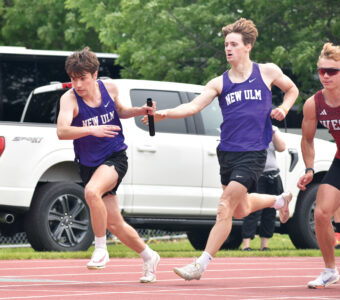 The New Ulm boys track and field team, in a file photo by Ari Selvey, broke three school records and qualified two relay teams to the state meet after astrong showing at the Section 2AA Boys Track and Field Championships at Gustavus Adolphus College.