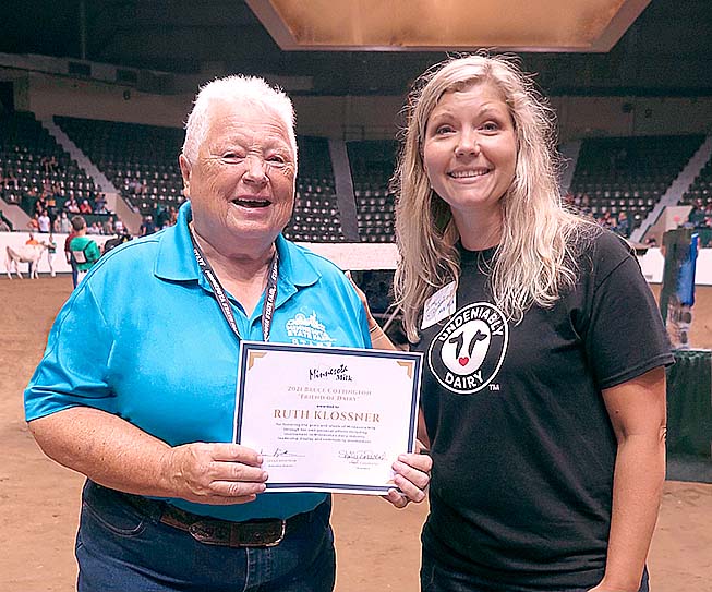 In a surprise announcement made during the 4-H dairy show at this year’s Minnesota State Fair, Ruth Klossner of Lafayette was presented with the Bruce Cottington Friend of Dairy award.