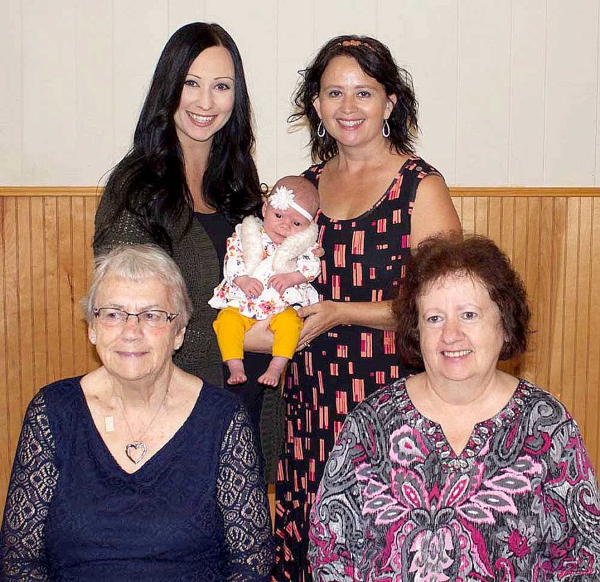 Lillian Fruhwirth of New Ulm recently celebrated the arrival of her great-great grandaughter, Scarlett Miller of St. Michael. The family is pictured above: (Bottom row, left to right): Lillian Fruhwirth of New Ulm and her daughterr Diane LeBrun of Gaylord. (Back row, left to right) great granddaughter Rebecca Miller and Scarlett Miller of Saint Michael and granddaughter Kimberly Becker of Gaylord.