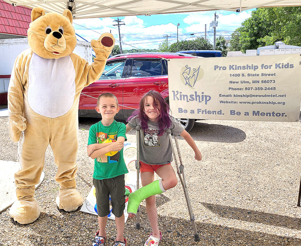 Pro Kinship for Kids held a fundraiser at New Ulm Dairy Queen on Friday, July 29, to raise money for our work with Brown County youth. Pro Kinship for Kids is the youth mentoring program for Brown County. The group provided games outside Dairy Queen and Kip the Kinship Bear was present at the event. Kip is the new mascot for Pro Kinship for Kids, and he will be seen around the county more and more. To learn more about Pro Kinship for Kids call 507-359-2445 or check out our website at www.prokinship.org. Pictured here from the left is Kip the Kinship Bear, Cayde Klossner and Ana Klossner.