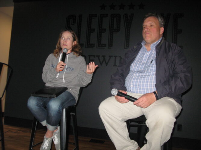 SLEEPY EYE — Minnesota Department of Agriculture Commissioner Thom Petersen and Minnesota Pollution Control Agency (MPCA) Commissioner Katrina Kessler talked about the Farm Bill and agricultural issues over pizza and beer at Sleepy Eye Brewing Co. Tuesday.