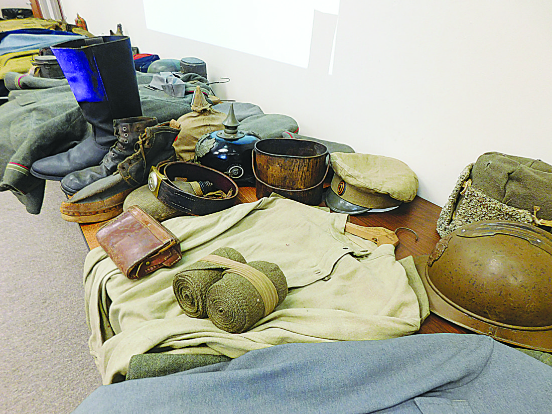 Doug Bekke, collector and former curator of the Minnesota Military Museum, brought in examples of World War I uniforms from several nations (above) and explained the background and significance of each piece, Thursday, at the Brown County Museum Annex.