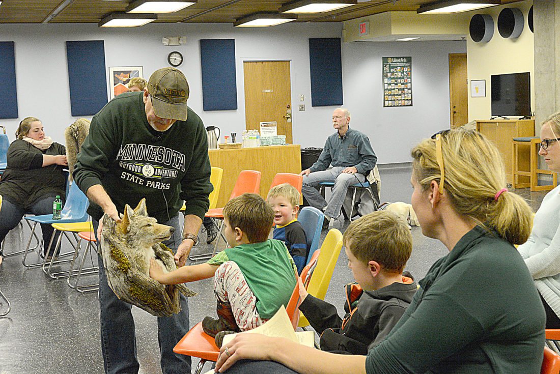 Staff photo by Connor Cummiskey Ron Bolduan, curator for the Nature Learning Center in Riverside Park, shows guests a coyote head during the presentation of creepy critters that he and naturalist Scott Kudelka gave at the New Ulm Public Library Wednesday evening.
