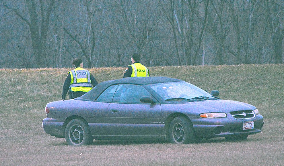 Staff photo by Connor Cummiskey A sedan left the roadway on Highway 15 coming into New Ulm near the 7th North Street bridge just before 5 p.m. Friday. The vehicle came to a rest in a depression between Hwy 15 and the Front Street exit where it remained, appearing mostly unharmed, until it was loaded onto a flatbed and taken away.