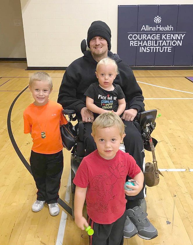 Submitted photo Delsin “Dee” Zamzow enjoyed a visit from sons Ryker, left: Dalton, front, and Zeke at Allina’s Courage Kenny Rehabilitation Institute Center in Golden Valley. Zamzow wasparalyzed in a dirt bike accident May 31, 2017. The Lafayette Lions Club is holding a benefit next week to raise funds to make his home handicapped accessible, so he can return home