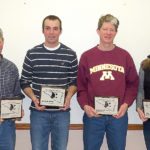 Six plaques, sponsored by area agricultural businesses, were presented for outstanding herds and cows during the DHIA business meeting. Award sponsors were Nicollet County Bank, St. Peter; New Ulm Regional Vet Center; Bill Seitzer of Form-A-Feed; Roger Landon of United Farmers Coop of Lafayette; and Glen Pettis of Big Gain Feeds.
