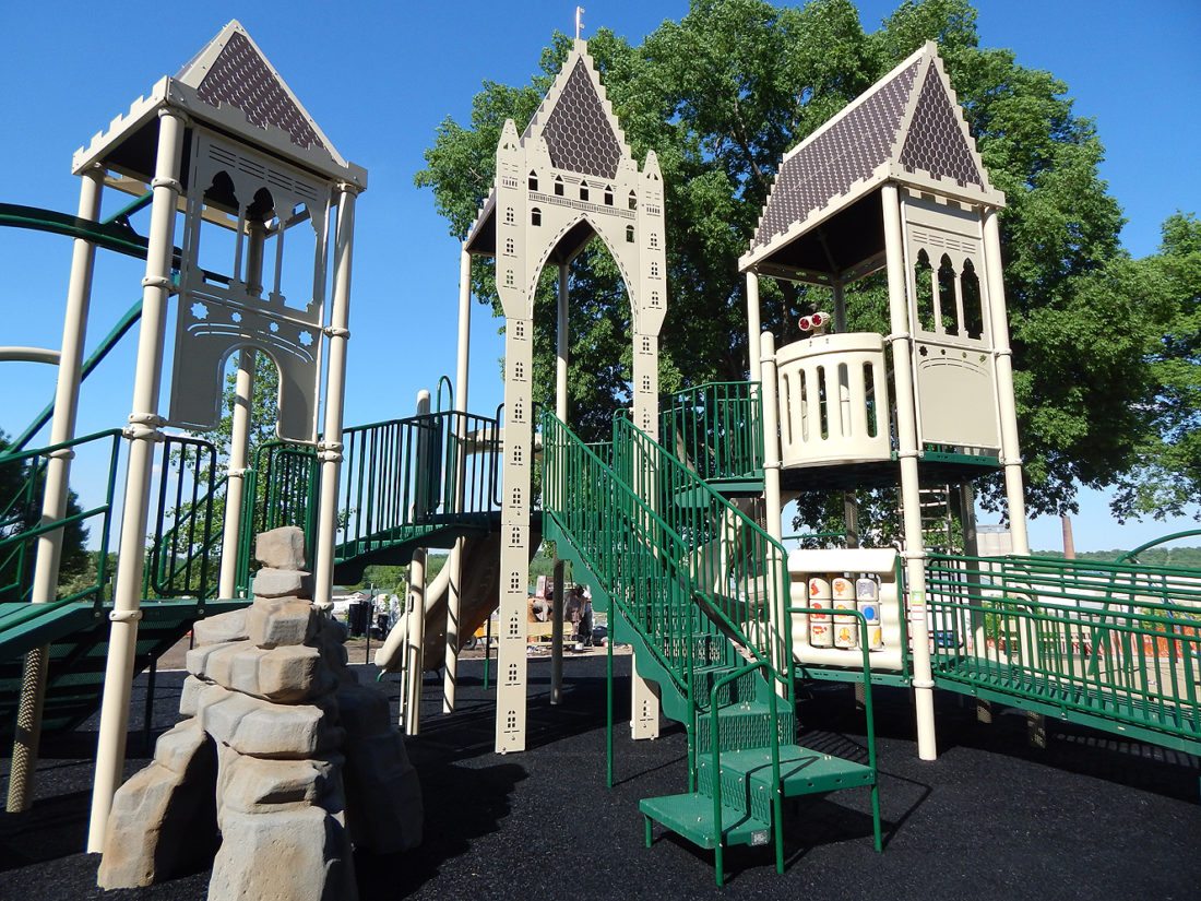 The Bavarian castle-style playground at German Park is nearing completion. Construction workers poured a rubberized surface at the new playground at German Park on Saturday, similar to the surface at the inclusive playground at Hermann Heights Park. The playground remains closed to the public to allow proper curing of the surface. The public is asked to stay out of the playground until all fencing and signage is removed.