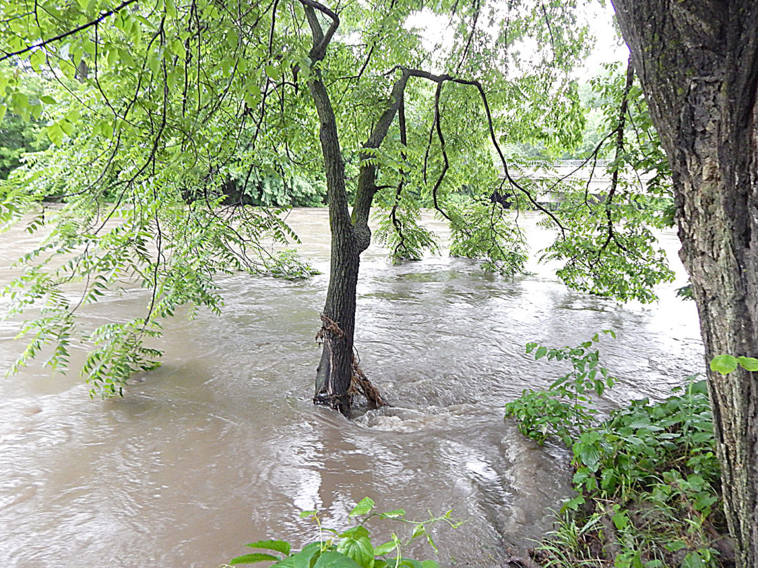 Staff photo by Fritz Busch The rain-swollen Cottonwood River races through Adams Park, near the Cottonwood Street bridge at the south edge of New Ulm, June 11. The river’s measured value was 11.99 feet at 10 a.m. June 11. The river level was measured at 12.08 feet June 10 and is forecast to rise to near 12.2 feet by early Wednesday, June 12.