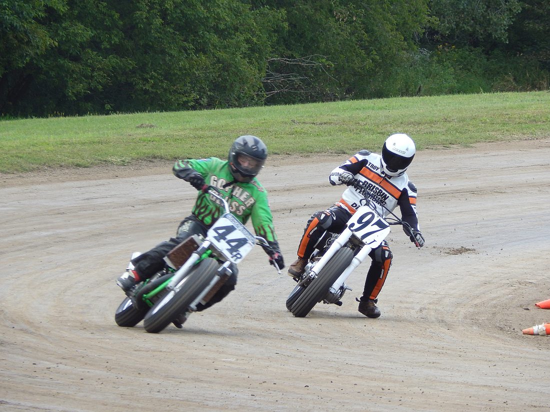 Larry Sparks (44) of Lake Crystal, left, and Troy Bisbin (44) of Nowthen compete in the Masters (over 50) division at the New Ulm Flying Dutchmen Motorcycle Club flat track races Saturday. Races continued Sunday.