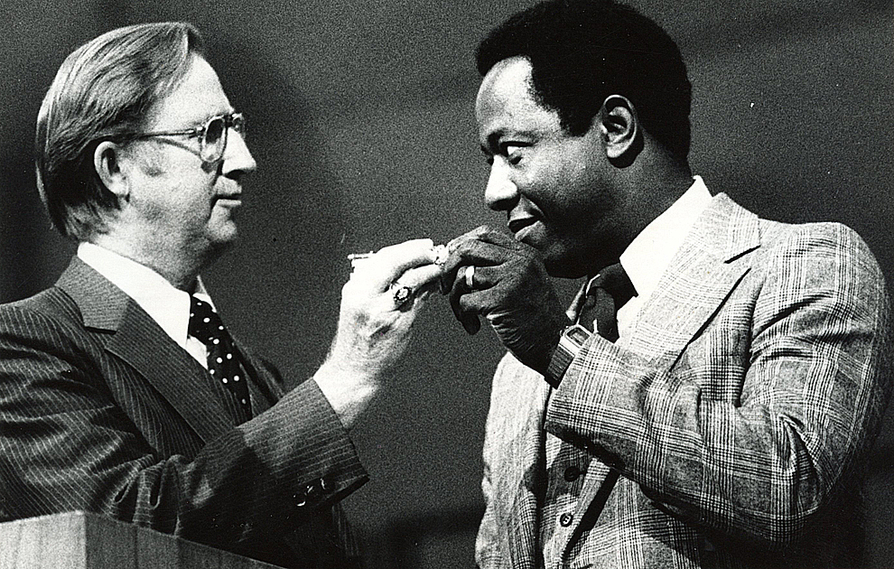 Submitted photo Former New Ulm Mayor Carl “Red” Wyczawski, left, gives his old friend Hank Aaron Keys to The City of New Ulm at the 1978 New Ulm American Legion Baseball Banquet. The event was held after the team advanced to the American Legion World Series in Yakima, Wash.