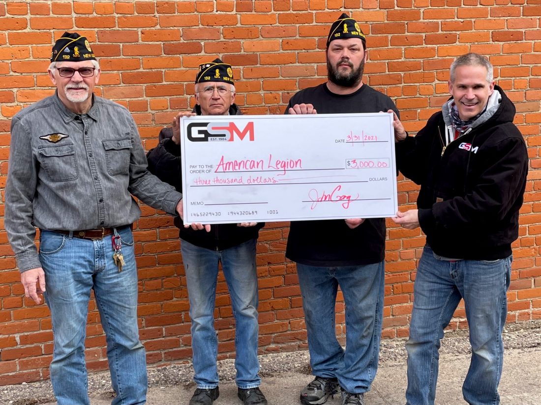 GSM (Gag Sheet Metal) recently donated $3000 to American Legion Post 132 in New Ulm. The donation was used to replace the heating and cooling unit that was purchased and installed by GSM. Pictured from left, John Gohr, past commander, Roger Hoffmann, first commander, Brian Krosch, commander, and Dan Backer from GSM.