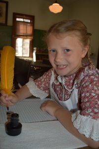 During the handwriting lessons Biebl said handwriting is less important today because most people are typing, but in the 1800s it was extremely important. Several of the kids struggled to master the quill and ink or fountain pen. Most were able to write their names, but few avoided getting ink on their hands.