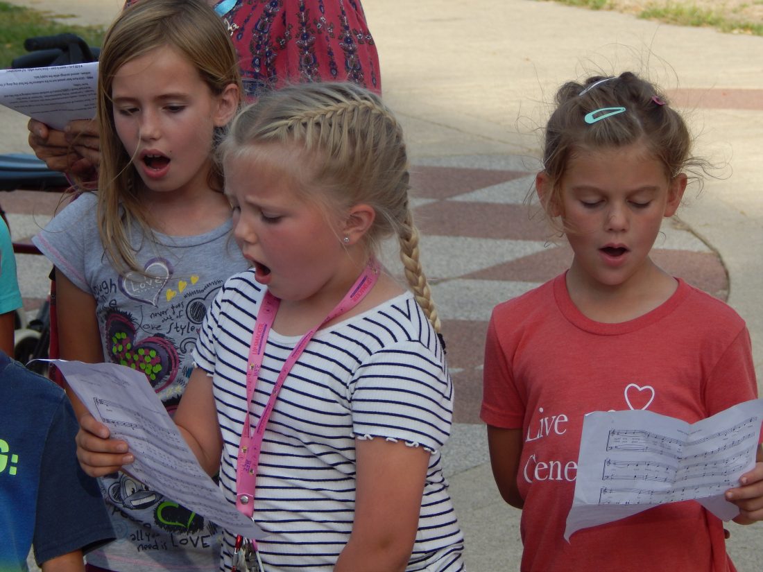 Staff photo by Fritz Busch Children sing the city anthem of New Ulm in its musical debut with the New Ulm Municipal Band in the German Park Amphitheater Sunday.