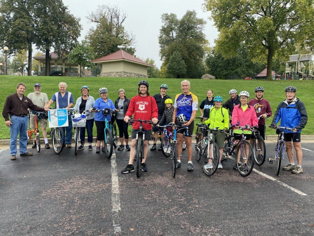 Bicycle riding enthusiasts participate in the George Glotzbach Memorial Bicycle Ride Saturday. The 11-mile ride began in the German Park lower parking lot. The ride celebrated the renewal of the City of New Ulm Bicycle Friendly Designation by the League of American Bicyclists and honored Glotzbach who advocated for New Ulm becoming bicycle friendly.