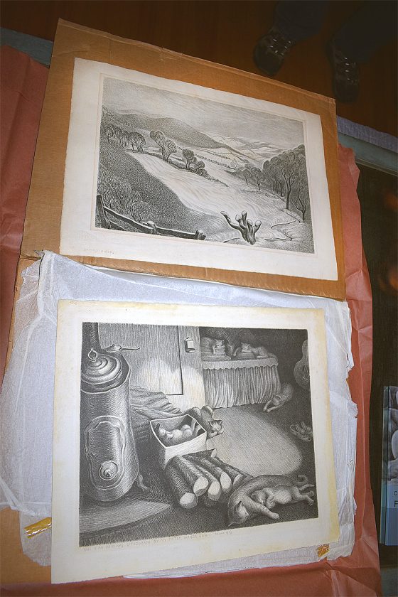 - Staff photos by Clay Schuldt Wanda Gag House Association members and J & R Schguel Trucking employees teamed up to bring items belonging to Wanda Gag back to her childhood home. L to R: Lee Knauf, John Meredith, Cara Knauf and Carrie Meredith stand in front a table displaying two original lithographs drawn by Gag and her studio mirror. Below: Wanda Gag lithographs “Snowy Fields” and “Siesta” were included with Gag’s donated mirror. The two lithographs were created by Gag in 1933 and 1937 respectively.