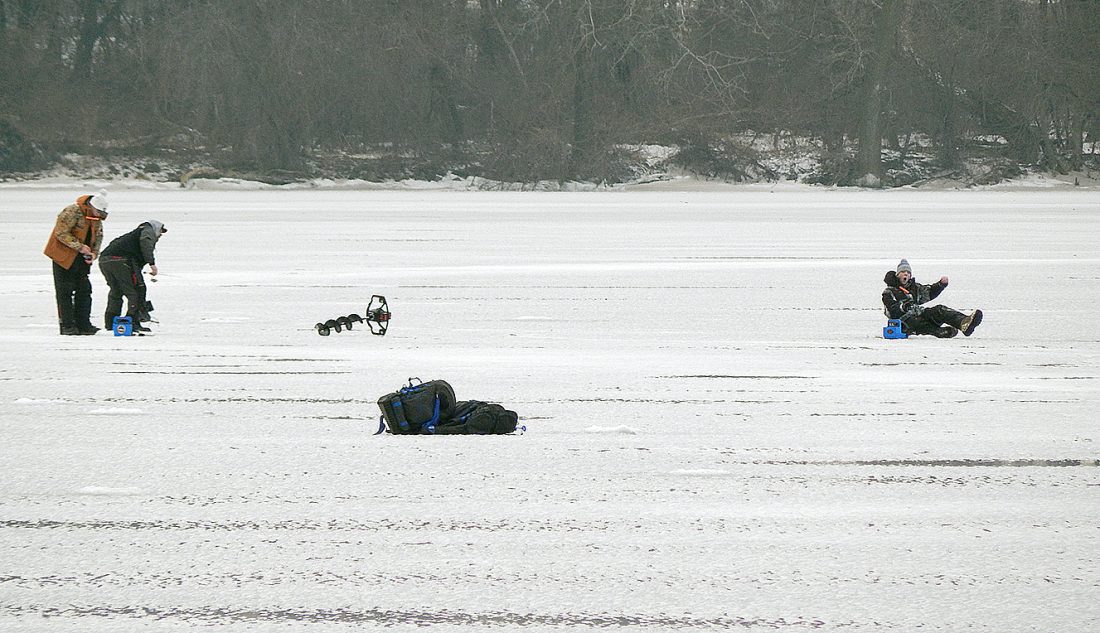 It appears an ice fishing enthusiast, right, takes a spill on Sleepy Eye Lake Christmas Eve morning. A number of people fished on the ice and in temporary ice fishing shelters as temperatures topped 40 degrees Friday.