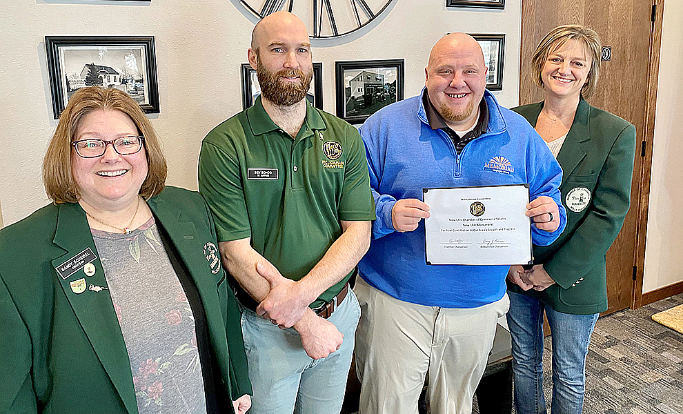 Submitted photo New Ulm Monument-Sunburst Memorials has a new building and new manager. The New Ulm Area Chamber of Commerce’s Willkommen committee stopped by to welcome Manager Jeff Kissner. He says the new facility was completely rebuilt on the site. The comfortable modern building gives people space for design and to view choices. Once the material and design are selected the memorial is made in the St. Cloud facility before being placed at the cemetery. With the area’s largest inventory of monuments, over 80 in stock, they are able to show you over 20 colors of granite, including different shapes, styles, and examples of the latest technology, such as high definition photo etching. Clients can have an in-store meeting, in-cemetery appointment, or via phone or e-mail. They service all areas, including New Ulm, Mankato, Sleepy Eye, Redwood Falls, Marshall, and all surrounding towns. Kissner originally is from St. Cloud where he met his wife and moved to New Ulm. He and his wife have two boys. Pictured here left to right: Sandy Schiebel from KNUJ & SAM, Ben Schoo from NU Surface, Jeff Kissner from New Ulm Monument, and Cathy Anderson from Alliance Bank.